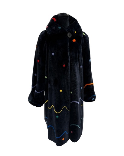 Black Sheared Beaver Coat by Saks Fifth Avenue with Multicolored Dots & Swirly Lines